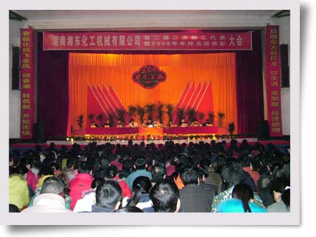 1月6日上午,湖南湘東化工機(jī)械有限公司第二屆二次職代會暨2008年度總結(jié)表彰大會在大禮堂召開,會議由黨委副書記、工會主席姜衡陽主持,董事長兼總經(jīng)理蘇成在會上作了題為《務(wù)實(shí)創(chuàng)新、精細(xì)管理、形成競爭優(yōu)勢,提升企業(yè)檔次》的工作報(bào)告,副總經(jīng)理林德晃宣讀了表彰勞動模范和先進(jìn)的決定,公司近千名員工到會并認(rèn)真聽取了報(bào)告。