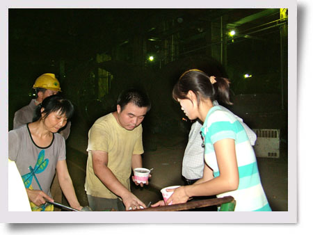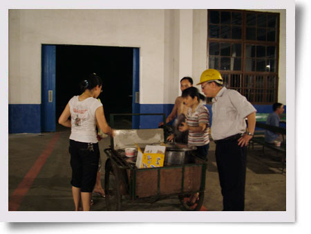 今夏持續(xù)高溫,自7月21日晚上起,湖南湘東化工機(jī)械有限公司35名機(jī)關(guān)人員堅持40天主動服務(wù)生產(chǎn)一線,每晚為戰(zhàn)斗在生產(chǎn)一線的現(xiàn)場施工人員送去冷飲等防暑降溫物資。 圖為7月21日晚上9點(diǎn)多鐘公司辦公室的員工在不銹鋼分廠等車間送冰綠豆粥的現(xiàn)場。(王慧卉)