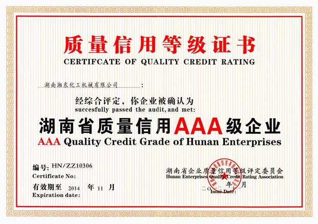 企業(yè)質(zhì)量信用等級(jí)評(píng)定活動(dòng)由省質(zhì)量技術(shù)監(jiān)督局、省社會(huì)信用體系建設(shè)領(lǐng)導(dǎo)小組辦公室及省信用建設(shè)促進(jìn)會(huì)聯(lián)合開(kāi)展。2012年9月,湘東化機(jī)向省企業(yè)質(zhì)量信用等評(píng)辦提交“省質(zhì)量信用AAA級(jí)企業(yè)”申報(bào)材料并順利通過(guò)了文件初評(píng),10月30日,省企業(yè)質(zhì)量信用等評(píng)辦評(píng)審專(zhuān)家組對(duì)湘東化機(jī)進(jìn)行了現(xiàn)場(chǎng)評(píng)定,評(píng)審組在根據(jù)公司的經(jīng)營(yíng)狀況、標(biāo)準(zhǔn)化管理和企業(yè)標(biāo)準(zhǔn)體系建設(shè)情況、計(jì)量管理和計(jì)量檢測(cè)體系建設(shè)情況、企業(yè)售后服務(wù)體系建設(shè)及消費(fèi)者意見(jiàn)反饋情況、合同履行情況、完稅情況、產(chǎn)品質(zhì)量情況(如產(chǎn)品監(jiān)督抽查結(jié)果、各種質(zhì)量認(rèn)證情況、采標(biāo)情況等)及近3年內(nèi)企業(yè)規(guī)范經(jīng)營(yíng)及獎(jiǎng)懲情況,依據(jù)“公正、客觀、科學(xué)”原則,在對(duì)公司和產(chǎn)品進(jìn)行全面了解、考察調(diào)研和分析的基礎(chǔ)上,對(duì)公司質(zhì)量信用行為的可靠性、安全性程度作出綜合評(píng)價(jià),最終經(jīng)評(píng)審組討論認(rèn)定,湘東化機(jī)符合質(zhì)量信用最高等級(jí)——AAA級(jí)企業(yè)評(píng)定要求,順利通過(guò)評(píng)定。