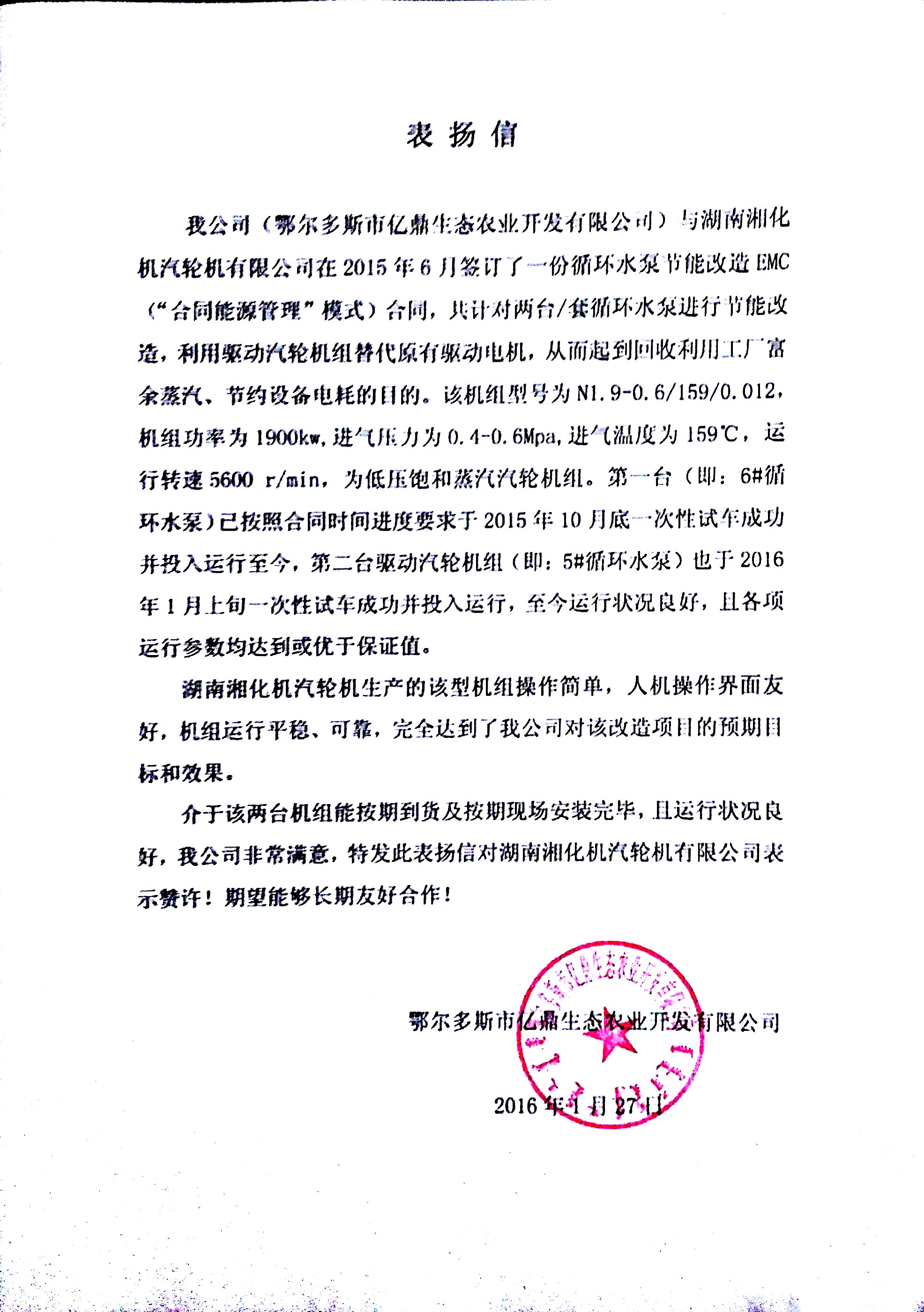 2016年1月27日,湘化機(jī)汽輪機(jī)公司收到鄂爾多斯億鼎生態(tài)農(nóng)業(yè)開發(fā)有限公司的表?yè)P(yáng)信,表?yè)P(yáng)汽輪機(jī)公司在2015年對(duì)億鼎生態(tài)農(nóng)業(yè)開發(fā)有限公司兩臺(tái)循環(huán)水泵的節(jié)能改造工作高度滿意,汽輪機(jī)公司利用驅(qū)動(dòng)汽輪機(jī)組替代原有驅(qū)動(dòng)電機(jī),該機(jī)組操作簡(jiǎn)單,人機(jī)操作界面友好,機(jī)組運(yùn)行平衡,投入運(yùn)行后狀況良好,完全達(dá)到了回收利用工廠富余蒸汽、節(jié)約設(shè)備電耗的預(yù)期目標(biāo)和效果,并期望與我公司長(zhǎng)期友好合作!