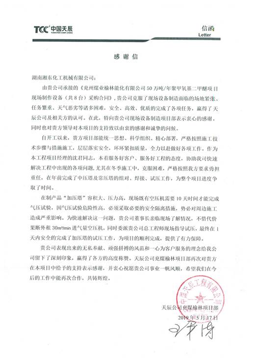 近日,我公司收到中國(guó)天辰有限公司兗煤榆林項(xiàng)目部感謝信,天辰公司為我公司提前圓滿完成榆林項(xiàng)目而表示感謝,全文如下: